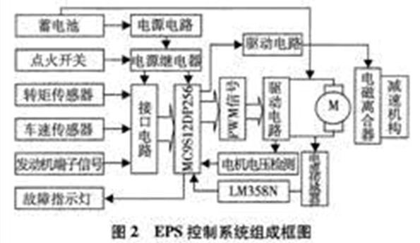 电动助力转向系统的硬件电路主要包括以下??椋篗C9S12DP256微控制器、电源电路、信号处理电路、直流电机功率驱动模块、故障诊断模块与显示??椤⒊邓俅衅?、扭矩传感器、发动机点火信号、电流及电流传感器等接人处理电路,另外还有电磁离合器等,EPS系统的硬件逻辑框架如图2所示。