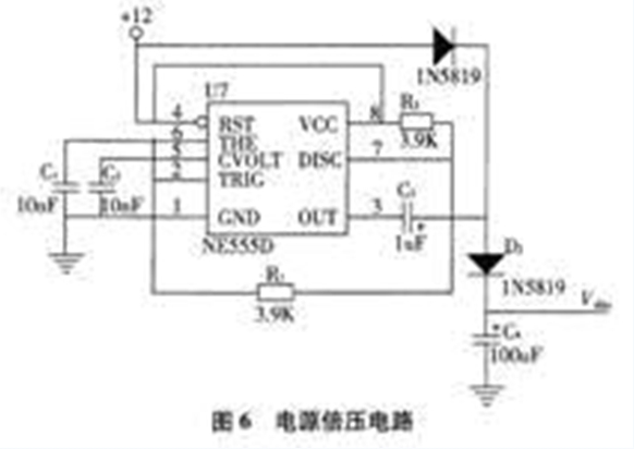 电源倍压电路如图6所示,NE555定时器工作于多谐振荡器模式,于引脚3产生幅值等于NE555的供电电压,频率为1/0.7(R2+2R1)C1的矩形波。C3、C4,Dl和D2构成电荷泵电路。当NE555引脚3输出高电平时,由于电容电压不能突变,C3正极电压为24V或接近24V,并通过D2向C4充电,使C4电压为24V或接近24V。由于受电路的工作效率、二极管D1和D2上的正向电压降以及负载能力的限制,使得系统输出电压低于供电电压的2倍,即供电电压为12V时,输出电压低于24V,当供电电源为12V时,倍压电源电压约为22.9V,大于Vdb1(22.74V),可以满足需要。