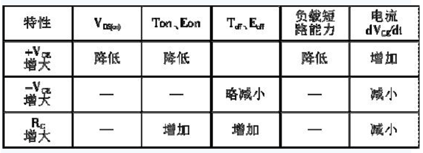 IGBT 的驱动条件与它的静态和动态特性密切相关。栅极的正偏压+VGE、负偏压-VGE 和栅极电阻RG 的大小,对IGBT 的通态电压、开关时间、开关损耗、承受短路能力以及dVCE/dt等参数都有不同程度的影响。门极驱动条件与器件特性的关系如表1 所示。