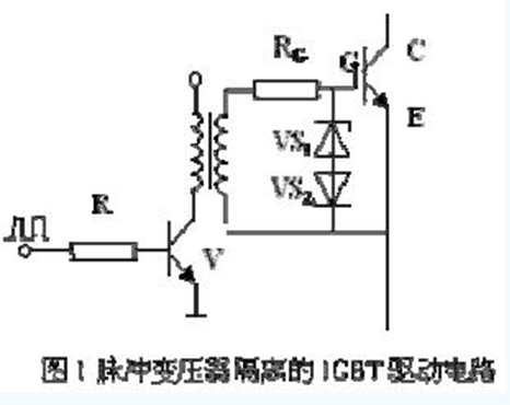 电路如图1 所示,这种电路结构简单,应用了廉价的脉冲变压器实现IGBT 主电路与控制电路的隔离。其性能的好坏取决于脉冲变压器的制作,应尽量减小脉冲变压器的漏感抗,并采用高铁氧体铁心,最高工作频率可达40KHz。