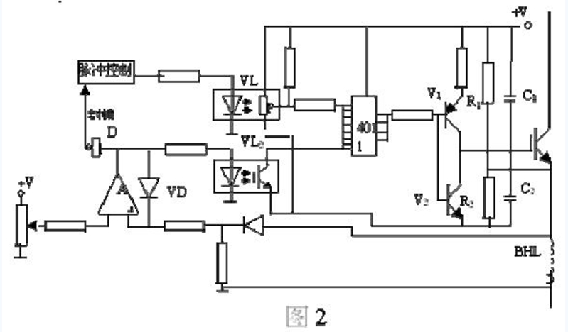 电路图如图2 所示,该电路自身带过流?;すδ埽怦詈掀鹘龀蹇刂频缏酚肭缏犯衾?,4011 的四个与非门并联工作提高了驱动能力,互补晶体管V1、V2 降低驱动电路阻抗,通过R1、C1 与R2、C2 获得不同的正、反向驱动电压,以满足各种IGBT 对栅极驱动电压的要求。该电路由于受光耦合器传输速度的影响,其工作频率不能太高,同时受4011 型CMOS电路最高工作电压的限制,使+VGE 和-VGE 的幅值相互牵制,并受到限制。