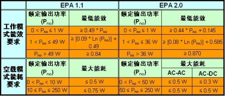 表1:美国环保署“能源之星”外部电源的1.1及2.0版规范。