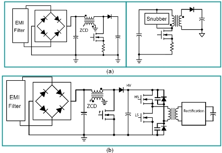 如前所述,一旦功率大于75 W,除了满足上述工作能效及空载能耗要求外,电路中还面临着加入PFC的要求,这在改善功率因数、使电网电能得到更高效利用的同时,也会使得电路结构更为复杂。在这类应用中,传统电源架构是PFC+PWM的两段式架构,即在非连续导电模式(DCM)或临界导电模式(CrM)段后跟随着准谐振反激段,每个段都使用一个控制器,如图2(a)所示。