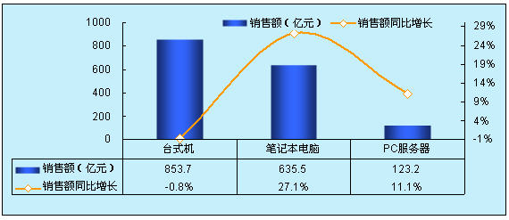 等行业对IT集中采购出现延后,部分中小企业资金也出现问题,采购有所停滞,不过,相比较其他IT硬件产品而言,笔记本电脑受影响程度相对较小,增速继续领跑。据赛迪顾问统计,2008年,中国笔记本市场销售量为901.8万台,同比增长43.2%,销售额达到635.5亿元,同比增长为27.1%。