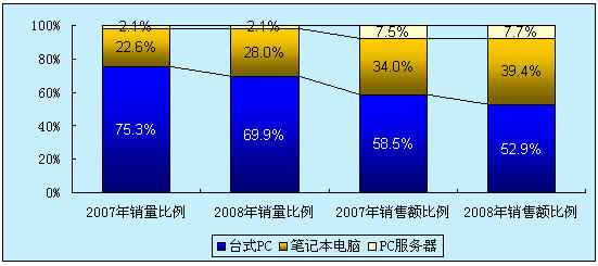 2009年中国IT市场年会上赛迪顾问发布的最新研究成果显示,2008年,包括台式PC、笔记本电脑和PC服务器在内的PCs市场销量达到3218.5万台,同比增长15.2%,销售额为1612.4亿元,同比增长9.6%,增速相比上一年都有较大的下滑。其中,台式PC与预期相比下降最大。