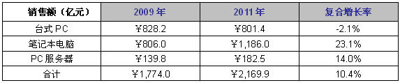 展望2009-2011年,电脑下乡将带动农村市场的发展、国家网吧牌照的松动将极大推动DIY市场发展、以3G为主导的各项投资在电信业的深入展开将打动PC服务器等产品需求的增加、国家4万亿拉动内需投资计划使得交通、医疗、环保等行业相关IT支出将会增加,再加上食品药品安全领域、农村信息化、医疗信息化等热点领域对IT产品的需求,PCs市场还是充满了机遇。如何把握住这些机遇,是企业目前亟待解决的重点。赛迪顾问预测,未来3年中国PCs市场销售额将达到2169.9亿元人民币,年均复合增长水平为10.4%。