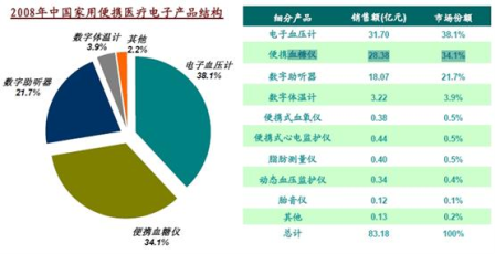 他的研究发现,在便携式医疗电子市场中,家用电子市场达到65.4%的份额,而且市场呈现加速增长的态势,2008年市场的增长速度达到28%!该市场中的电子血压计、便携式血糖仪和电子助听器占据了90%以上的销售份额。由于目前市场普及率还不高,加之中国人口基数比较大,所以他认为家用便携式医疗电子产品前景非常好。