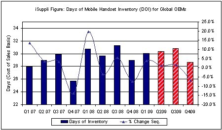 下图所示为iSuppli公司对OEM手机库存天数的预测。