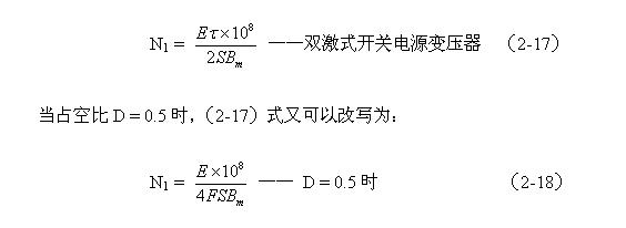 (2-18)式虽然是用于计算双激式开关电源变压器初级线圈N1绕组匝数的公式,但只需把式中的某个别参数稍微进行变换或修改,同样可以用于计算其它波形电源变压器初级线圈匝数的公式。