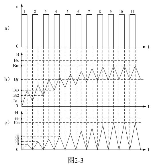 在图2-1中,当有直流脉冲电压输入变压器初级线圈a、b两端时,在变压器初级线圈中就有励磁电流流过,励磁电流会在变压器铁芯中产生磁通