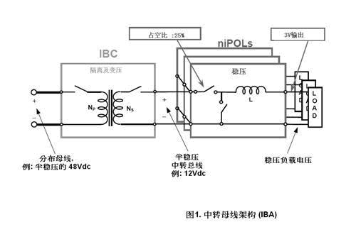 IBA的理念是把母线电压降至一个稍稍高于负载点的电压,再由较便宜的降压器(niPoL)来完成余下的工作。降压器(niPoL)经由电感器传输电压到负载,这电压相等于上开关和下开关共同端电压的平均值,等如上开关电压占空比与中转母线的乘积。