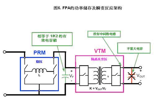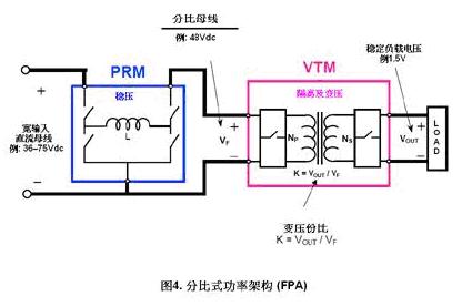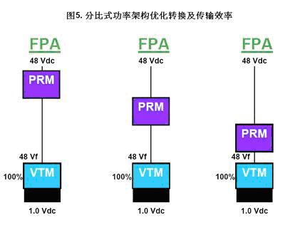 跟分布式架构或中转母线架构不一样,在分比式架构,稳压功能由PRM提供,可远离负载。VTM作为负载点的转换器,它不需要提供稳压的功能,?可以无须靠近负载。它只负责按K比值“倍大电流”或“降低电压”(VOUT=VfK),VTM可在整个转换周期传送电流,它的占空比是百份之一百。FPA以分比母线传输功率,可以较随意的选择电压,无须如前所述的IBA架构,因固有的冲突,中转电压只能选定在稍高于负载的电压,否则它的占空比将无法管理。