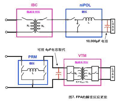 FPA的瞬变反应较IBA理想。如前述,IBA把电感器放在中转母线与负载之间,产生电流惯性。在FPA分比母线与负载之间没有电感器(图6),由于VTM不受电感惯性左右,可快速的反应负载变化。在分比母线的电容由于没有电感的阻隔,可对负载有效旁路,该电容相等于在负载加上1/K2倍电容值,这便无须在负载点加上大电容。图7清楚表示在FPA只需用上4uF的电容便可以取代IBA中的10000uF电容。