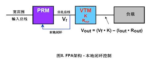 本地闭环(图8)是最简单的方法。PRM感应它自己的输出电压,再调整及维持分比母线电压在一个常数。负载电压按VTM的输出阻抗的比例升降(VfK-IoutRout)。一个PRM可同时连接多个VTM。