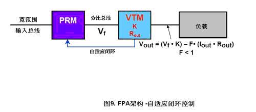 自适应闭环(图9)。由VTM把讯号传送给PRM,让PRM调整分比母线。以补偿VTM的输出阻抗。自适应闭环只需要在VTM与PRM之间接上简单、非隔离的反馈电路,它的稳压精度便可达+/-1%。