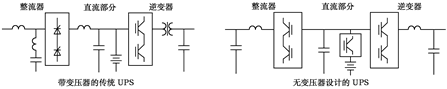 自从小功率UPS问世以来,无变压器UPS设计经历了20余年的发展。如今30kVA以下的UPS绝大多数都是无变压器的,这意味着UPS并不一定需要市电频率(工频)的磁性部件(变压器或电感)。这种无变压器设计的趋势在向着大功率段发展,因为工频磁性部件是原材料和劳动力密集型工业产品,而高频电力电子设备是技术密集型产品。