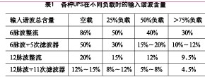 为了提高输入指标,还可以采用12脉波整流器和输入滤波器。但这些将增加尺寸、重量和成本,并降低整体效率。在满载时输入指标可以达到THD<5%,PF>0.95,但在半载或更低负载时输入指标将严重恶化。各种UPS在不同负载时的输入谐波含量如表1所示。