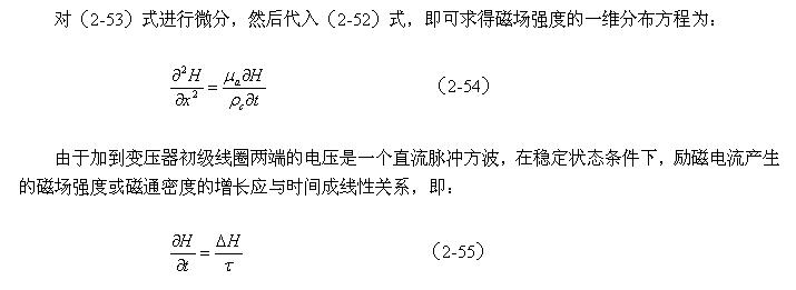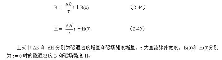 当有一个直流脉冲电压加到变压器初级线圈的两端时,在变压器初级线圈中就就有励磁电流通过,并在变压器铁芯中产生磁场强度H和磁通密度B,两者由下式决定: