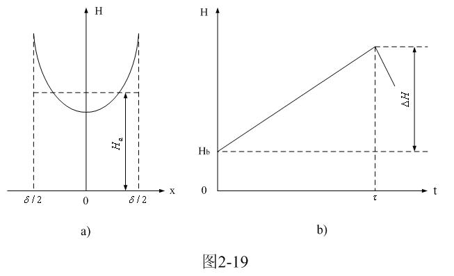 [page]图2-19-a和图2-19-b分别是由(2-61)式给出的,铁芯片中磁场强度按水平方向分布的函数H(x)和按时间分布的函数H(t)曲线图。