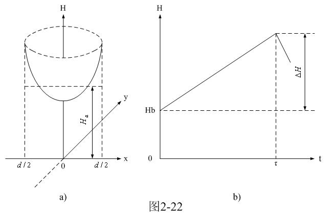 图2-22-a和图2-22-b是圆柱形铁芯中磁场强度按水平分布的函数H(x,y)曲面图和按时间分布的函数H(t)曲线图。