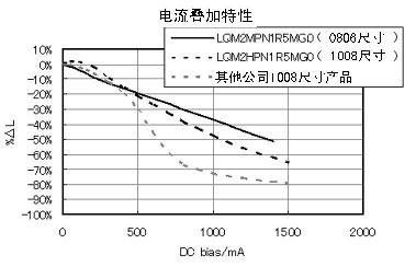 通过直流电流后感值偏执特性良好,可以作为各功率电感的特长。电流-感值偏执特性是指功率电感通电时,电流变大引起感值下降的性质。这是叠层型功率电感的封闭磁路构造导致的磁通量饱和引起的,因此为了克服这个弱点,开发新技术以降低叠层铁氧体中的磁通量分布,从而改善电流的叠加特性,最后反映在各个产品上。