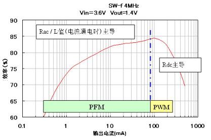 DC-DC转换器的电源转换效率和功率电感性能之间的关联如图3所示。PFM是指手机在待机状态下保持低电流负荷的模式,这时电源转换效率性能是与功率电感的Rac (交流电阻) 以及电流-感值偏执特性相关。图4当中显示了各功率电感的Rac特性以及图5中开关频率数是4MHz的DC-DC转换器IC的电源转换效率特性。