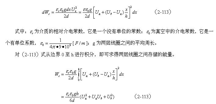 设两个线圈相对应的两表层间的电场近似均匀分布,即近似平板电容器的电场,那么,根据(2-112)式就可以求得该电场贮存的能量为: