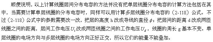 当变压器的线圈为多层时,我们只需反复利用(2-117)式来对相邻两层之间的分布电容独立进行计算,然后把结果相加即可。如果一定要写出计算多层线圈分布电容的表达式,则变压器多层线圈的分布电容可表示为: