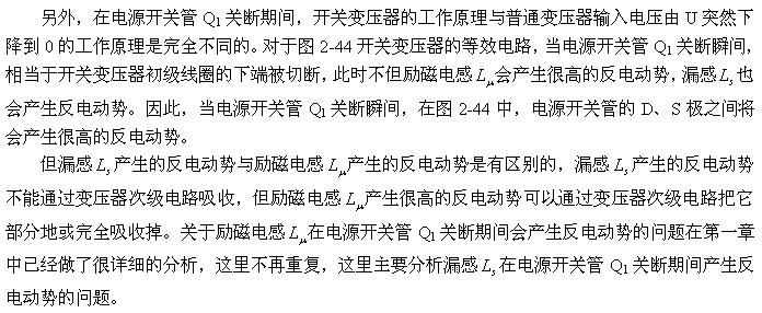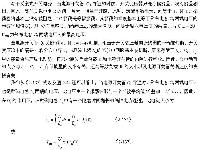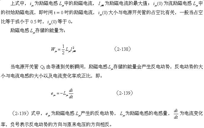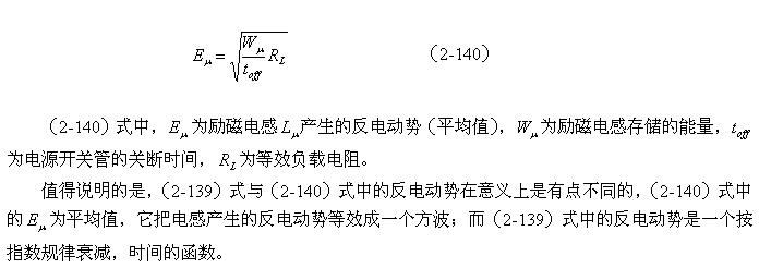 (2-140)式对于计算漏感 产生的反电动势或其它电感产生的反电动势同样有效。漏感 中存储的能量可根据(2-138)式求得;而流过漏感 的电流,对于反激式开关电源:可认为与励磁电流的大小基本相等,因为,在反激式开关电源中,等效负载电阻等于无限大;对于正激式开关电源:可认为与流过等效负载电阻的电流大小基本相等,因为,在正激式开关电源中,励磁电流相对于流过等效负载电阻的电流,很小。