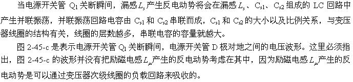 图2-47中的D1、R1、C1是抑制漏感以及励磁电感产生反电动势和振铃电压幅度的有效电路。当变压器初级漏感以及励磁电感产生反电动势时,反电动势通过二极管D1对电容器C1进行充电,相当于电容器把反电动势的能量吸收掉,从而降低了反电动势和振铃电压的幅度。