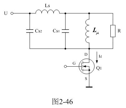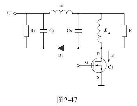 在图2-46中,Cs1、Cs2都是分布电容,它们对于漏感 来说,既可以产生串联振荡,又可以产生并联振荡。在电源开关管Q1导通瞬间,漏感与分布电容主要是产生串联振荡,因为输入电压开始向串联振荡回路提供能量;在电源开关管Q1关断瞬间,漏感与分布电容主要是产生并联振荡,因为漏感 必须要通过并联回路释放能量。在实际应用中,漏感相对于励磁电感 来说很小,因此如果不考虑漏感的作用,完全可以把Cs1、Cs2看成是一个分布电容。