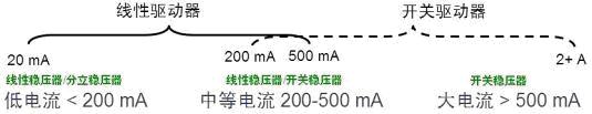 市场上典型的LED驱动器包括两类,即线性驱动器和开关驱动器;大概的适用范围见图1。如电流大于500mA的大电流应用采用开关稳压器,因为线性驱动器限于自身结构原因,无法提供这样大的电流;而在电流低于200mA的低电流应用中,通常采用线性稳压器或分离稳压器;而在200至500mA的中等电流应用中,既可以采用线性稳压器,也可以采用开关稳压器。