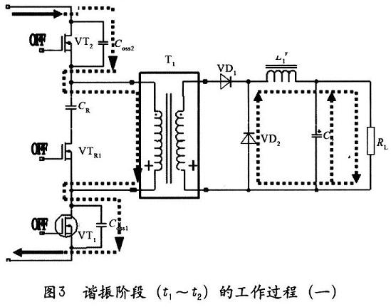 2)谐振阶段(t1~t2),如图3所示,在占空比的控制下,第一主开关管VT1和第二主开关管VT2在t1时刻同时关断,变压器磁芯极性反转。因输入电源和变压器的励磁电感的作用给VT1和VT2的寄生电容COSS1,COSS2充电,由于电容电压不能突变,第一主开关管VT1和第二主开关管VT2在ZVS状态下关断。同时变压器的励磁电流开始给钳位开关管VTR1的寄生电容COSS放电,经VTR1的体二极管给钳位电容CR1充电。次级VD1截止,VD2导通,L1经过VD2续流继续给负载RL供电。