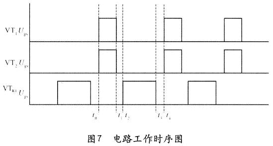 4)谐振阶段(t2~t4),如图6所示,t3时刻钳位开关管VTR1在ZVS状态下关断(VTR1的寄生电容使电压不能突变),由于变压器初级电流仍然反向流动,磁芯极性反转,使第一主开关管VT1和第二主开关管VT2的寄生电容COSS放电,在t3后VD1导通,VD2截止;然后其主开关管的体二极管导通把能量全部送回输入电源与负载,变压器磁芯完成磁复位。此时主开关管VT1和VT2的UDS电压为零,t4时刻同时开启第一主开关管VT1和第二主开关管VT2做到ZVS导通。在t4完成后,开关周期又返回到t0~t1的状态。
