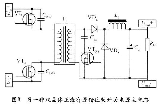 双晶正激有源钳位软开关电源还有另一种结构,如图8所示。其结构与图1所示的双晶正激有源钳位软开关电源基本相似,只钳位开关管VTR3以及钳位电容CR3设置在副边,钳位电容CR3一端与变压器的同名端相连,另一端与钳位开关管VTR3的D极相连,钳位开关管VTR3的S极与变压器的异名端相连,请参阅图8。其工作原理同在初级钳位相差不多,这里不再讲述。