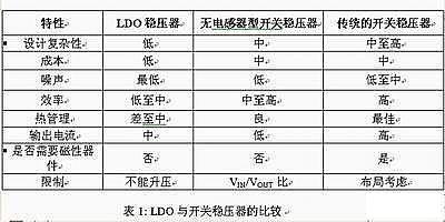 对于可满足手机内部电源转换需求的不同电压稳压器,我们必须认真考虑它们的优缺点(见表1)。目前有三种选择:线性LDO稳压器、无电感型开关稳压器(亦称为充电泵)以及传统的开关稳压器(基于电感器)。