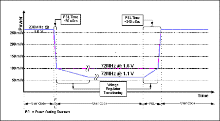 一般来说,内核电压会保持为1.6V。不过我们也可用功率调整程序库安全地将电压降至1.2V,从而在算法不运行期间使功耗进一步降低30mW。
