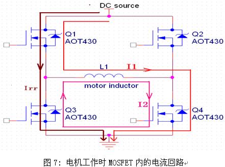 延长MOSFET的开通时间可以减小开通时的涌入电流。由于电机负载为感性负载,所以在PWM关断时存在续流现象(见图7中的I2),为了减小续流侧反向恢复电流(Irr)的大小,PWM侧开关管的开通速度不宜过快。由于MOSFET处于饱和区时有公式:Id=K*(Vgs-Vth)2,(K为一常数,由MOSFET的特性决定)。所以在一定的温度和Vds条件下,从MOSFET的门极驱动电压Vgs可以判断MOSFET中的电流大小。图5中Vgs峰值为9.1V,图6中Vgs峰值为6.4V,所以增加电容使得峰值电流减小。Id也可从MOSFET的转移特性图中获得。