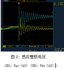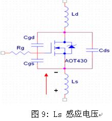 感应栅极电压如图8中的CH1所示,其值已达到2.3V。另外,由于源极引线电感的存在,在Q3内的电流迅速减小时,会在Ls的两端感应出一个极性为上负下正的电压,如图9所示,此时加在DIE上的电压Vgs(die)要大于在外部引脚上测量的Vgs电压,所以由于Ls的影响,使得MOSFET有提前导通的可能。如果下管由于感应电压而导通,则会造成上下管穿通,如果MOSFET不能承受此穿通电流,MOSFET就会损坏。