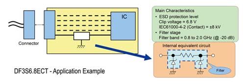 东芝美国电子元器件公司(TAEC)最新推出具有静电放电(ESD)?;ず偷绱鸥扇牛‥MI)滤波的二极管。东芝DF3S6.8ECT?;ざ芴峁┦趾鸵贫骷纾菏只琍DA,笔记本电脑,数码相机,以及具有EMI和ESD?;さ腉PS设备,这些静电放电能源通过用I/O端口和通过连接器进入到系统电路板上。