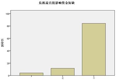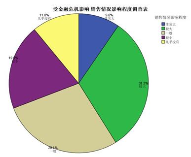 受金融?;挠跋?,销售情况影响程度非常大的公司比重占9.6%,影响较大的为31.5%,几乎没有影响的只有11.0%(如下图:受金融?;跋煜矍榭鲇跋斐潭鹊鞑楸恚?。