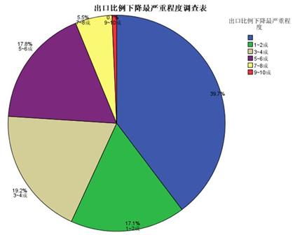 [page](二)出口下降最严重程度5-6成者比重最大,目前为止基本上已大部分恢复金融风暴,全球经济重创,对出口为主的企业影响最为惨重,尤其是对于以出口为导向的我国行业企业,损失惨重。数据显示,受金融危机影响,出口比例下降最严重程度5-6成者比重最大,占17.8%,下降1-2成者比例也不低,占17.1%(如下图:出口比例下降最严重程度调查表。备注:蓝色部分39.7%比例为单一内销型企业)。