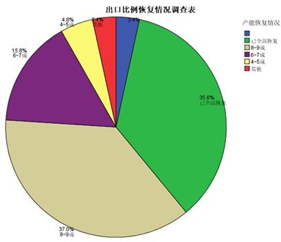 目前,就出口比例恢复情况来看,虽然仅35.6%企业出口已全部恢复,但恢复8-9成以上者占了72.6%的比重,可见,出口受影响已大部分恢复。