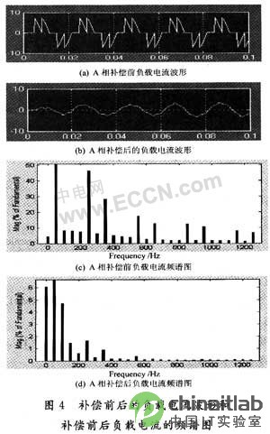 为了验证上述谐波检测和控制方案的有效性以及由此构成的基于DSP的并联型有源电力滤波器是否能很好地补偿谐波和无功电流,本文进行了实验。采用阻性负载作为三相不控桥式整流器的负载,试验中在负载侧接了1个2Ω的电阻。下面以A相为例给出实验波形。图4分别给出了补偿前后的负载电流波形和补偿前后负载电流的频谱图。