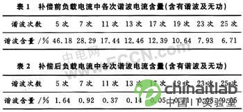 负载电流中含有高次谐波及无功电流时,负载电流总谐波畸变率THD=63.86%,负载电流中各次谐波电流含量见表1;补偿后电源电流总谐波畸变率THD=5.35%,电源电流各次谐波电流含量见表2。