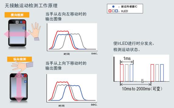 Rohm公司的另一个重要的产品是单片光学式接近传感器/照度传感器芯片BH1771GLC。Rohm公司设计中心所长福田明介绍,“BH1771GLC在单芯片上安装有检测可见光的光电二极管和检测红外光的光电二极管,在感知1cm ~ 10cm 程度的接近的同时,作为照度传感器可以检测0 ~ 65,000Lux。而且,扩大距离传感器功能,安装了业界首创无接触动作检测功能。所谓无接触动作检测,即以BH1771GLC驱动多个红外线LED(最多3 个),检测各个LED 的反射光相位偏差,并感知反射物(人的手)的动作方向的功能。如果使用这一功能,不需要直接接触显示器,在距离显示屏5cm 左右的高度通过挥手动作也能操作。借此,即使没有安装触摸显示屏的显示器设备也可以进行动作操作。”可以想象,采用该方案过后,不用接触屏幕或按键就可以实现翻页、换歌,或浏览网页的功能,这对手机制造商来说无疑是个绝佳的创新卖点。