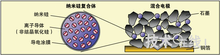 该公司的硅类负极材料的特点是,含有将粒径仅为nm大小的硅分散于非结晶SiO(氧化硅)内的“纳米硅复合体”(图1)。而非结晶SiO可缓和硅的膨胀及缩小程度。实际上是利用碳覆盖SiO的粒子表面,以提高导电性,然后与原来的负极材料——石墨混合起来利用。