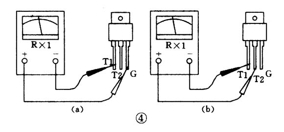 (2)把黑表笔接T1极,红表笔接T2极,电阻为无穷大。接着用红表笔尖把T2与G短路,给G极加上负触发信号,电阻值应为十欧左右(参见图4(a)),证明管子已经导通,导通方向为T1一T2。再将红表笔尖与G极脱开(但仍接T2),若电阻值保持不变,证明管子在触发之后能维持导通状态(见图4(b))。