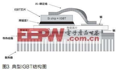 图3显示了带基板的功率??榈慕峁?。两侧都带薄铜层的陶瓷衬底被焊接在基板上。IGBT芯片被焊在设计好的铜层上。芯片的表面通过绑定线(bondingwire)压焊到铜层上。大多数标准??椴捎谜庵种谱鞣椒?。目前70%到80%的功率??槎及凑毡曜寄?榻峁估粗圃?。陶瓷一般采用Al2O3,基板采用铜为材料。IGBT底板通过导热硅脂安装散热器。