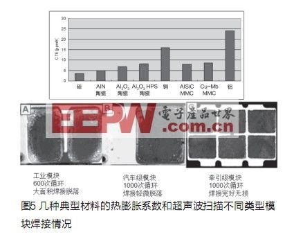 IGBT模块由多层不同材料组成(见图3),每种材料具有不同的CTE(热膨胀系数),CTE的差别会影响功率模块的使用寿命,当??槭褂檬?,温度的变化会在不同层间产生机械应力而导致焊接脱落,我们的目标是选用热膨胀系数差别尽可能小的材料来进行焊接组合。但另一方面,即使它们的热膨胀系数十分匹配,因为材料本身的成本可能会太高,或者在生产过程中难以被加工或加工成本太高。例如列车牵引应用中的AlSiC基板。热膨胀系数和衬底几乎相同,因此有更好的热循环特性。但对混合动力车应用因成本过高而很难被接受。